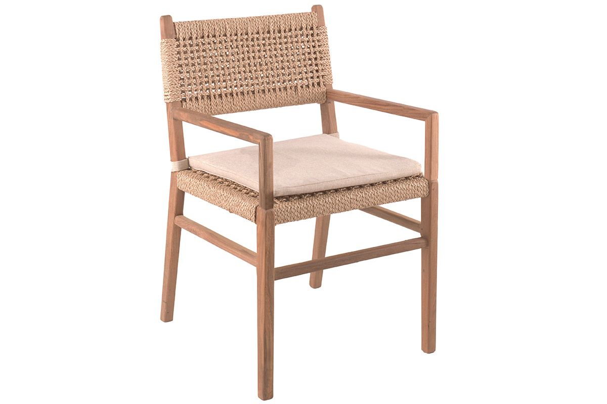 Fauteuil de table en teck et résine tressée avec un coussin d'assise en tissu Sunproof de couleur écru. Crée une ambiance confortable et chaleureuse autour d'une table de jardin.