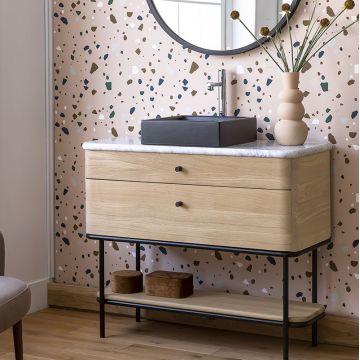 Petit meuble vasque de charme en chêne avec 2 tiroirs, une étagère et un piètement métallique noir. Sa longueur de 80 cm permet de l'installer dans un petit espace. Le plan de toilette est en pierre naturelle ou en chêne pour recevoir une vasque. Avec sa jolie ligne, ses angles arrondis et ses matériaux authentiques, cet ensemble habille avec élégance le coin toilette.