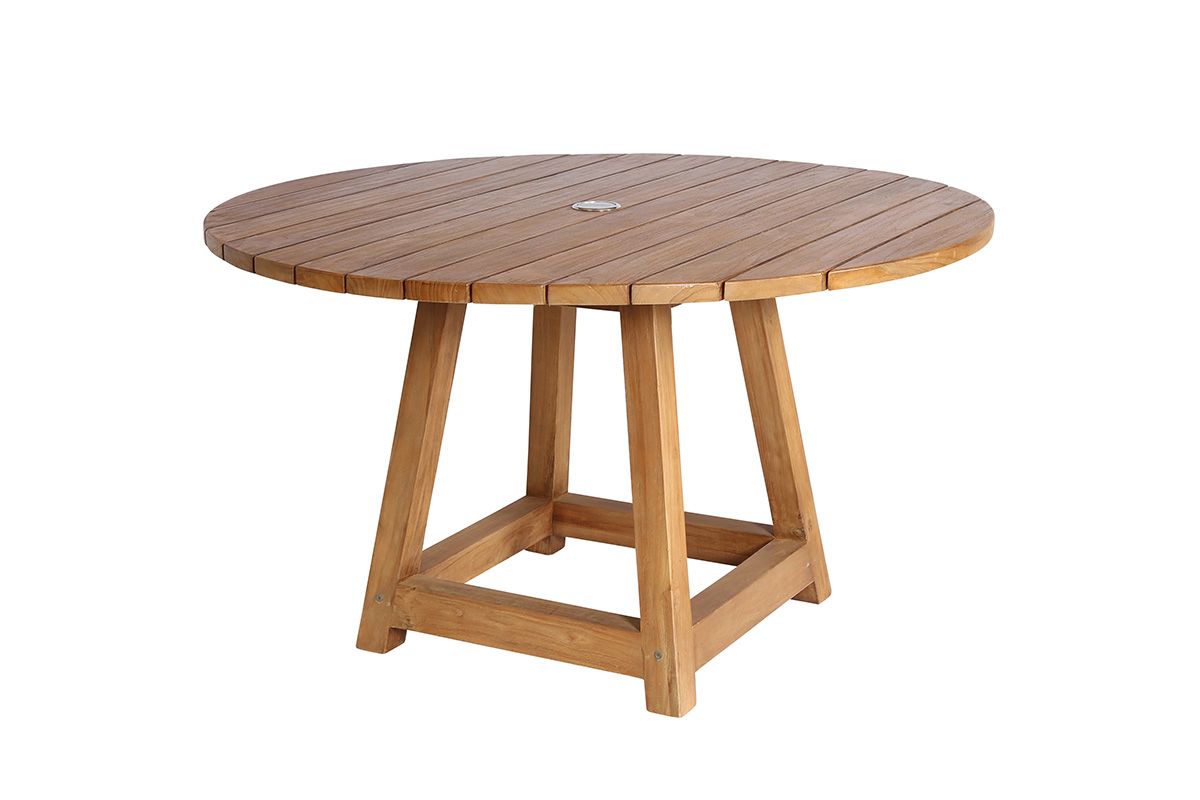 Table ronde en teck massif 120 cm pour le jardin. Charme assuré de l’aspect brut du bois ancien. Trou central pour le mât de parasol. Cette table ronde en bois convient pour 6 à 8 couverts en fonction de la largeur des sièges. Cette table ronde en teck est très stable grâce à son empiètement et sa conception robuste. Elle est de bonne taille pour partager des repas joyeux en famille. Coté style, le bois s'accorde aisément avec tout type de sièges et particulièrement avec les fauteuils en bois ou en rotin.