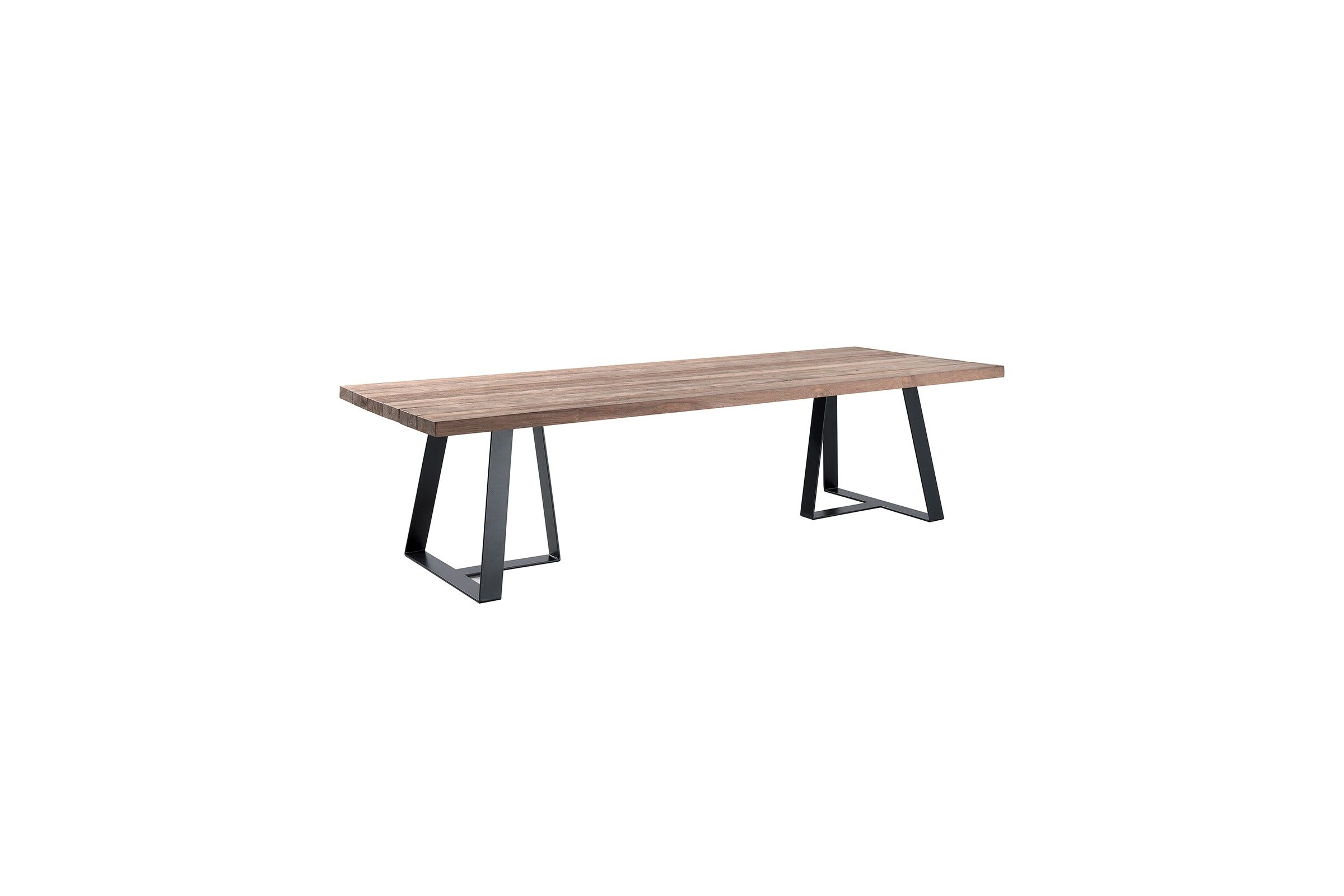 Table de jardin en teck massif recyclé avec des pieds en acier ton noir. Finition brute pour le plateau en teck pour un charme authentique. La forme du plateau est rectangulaire.