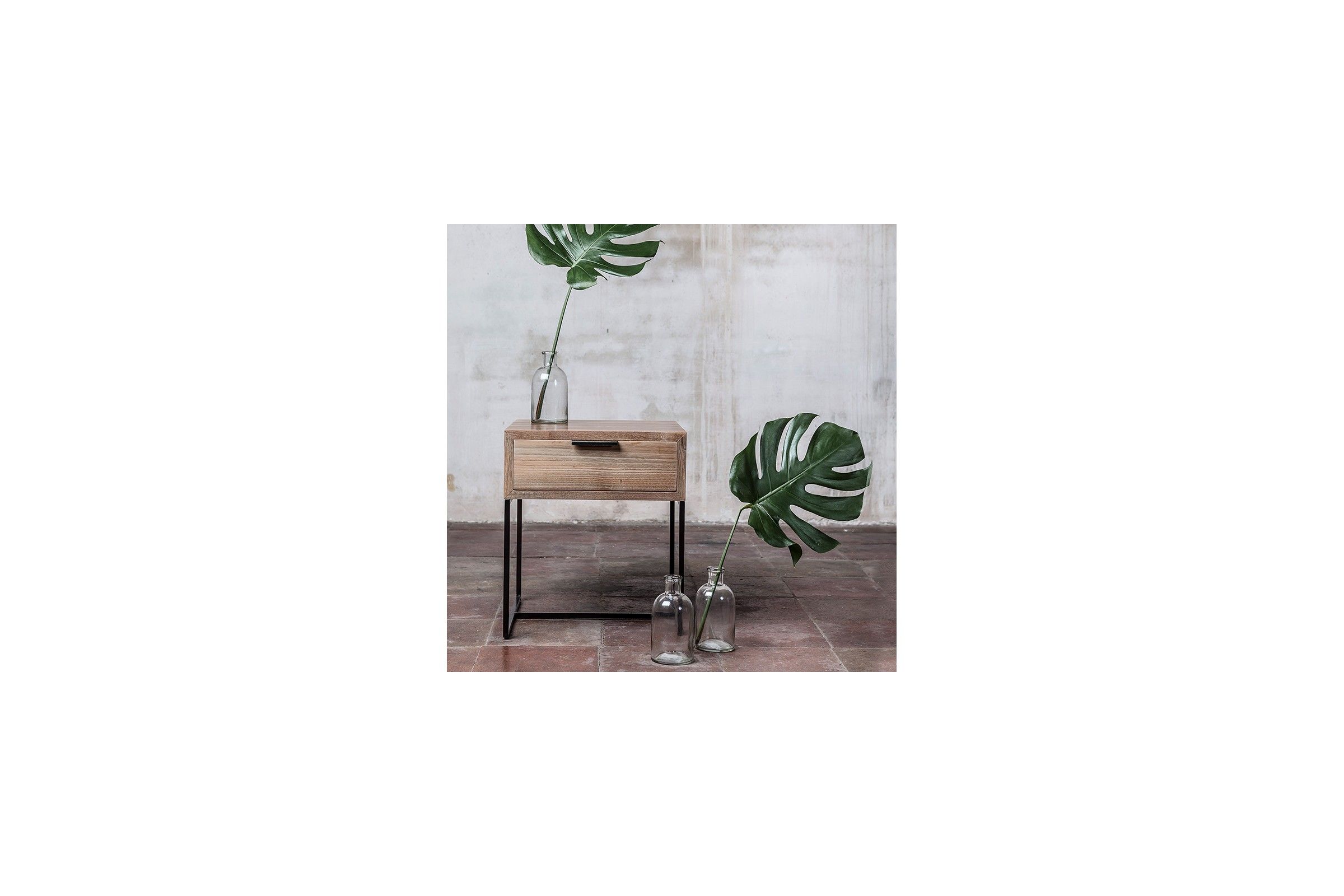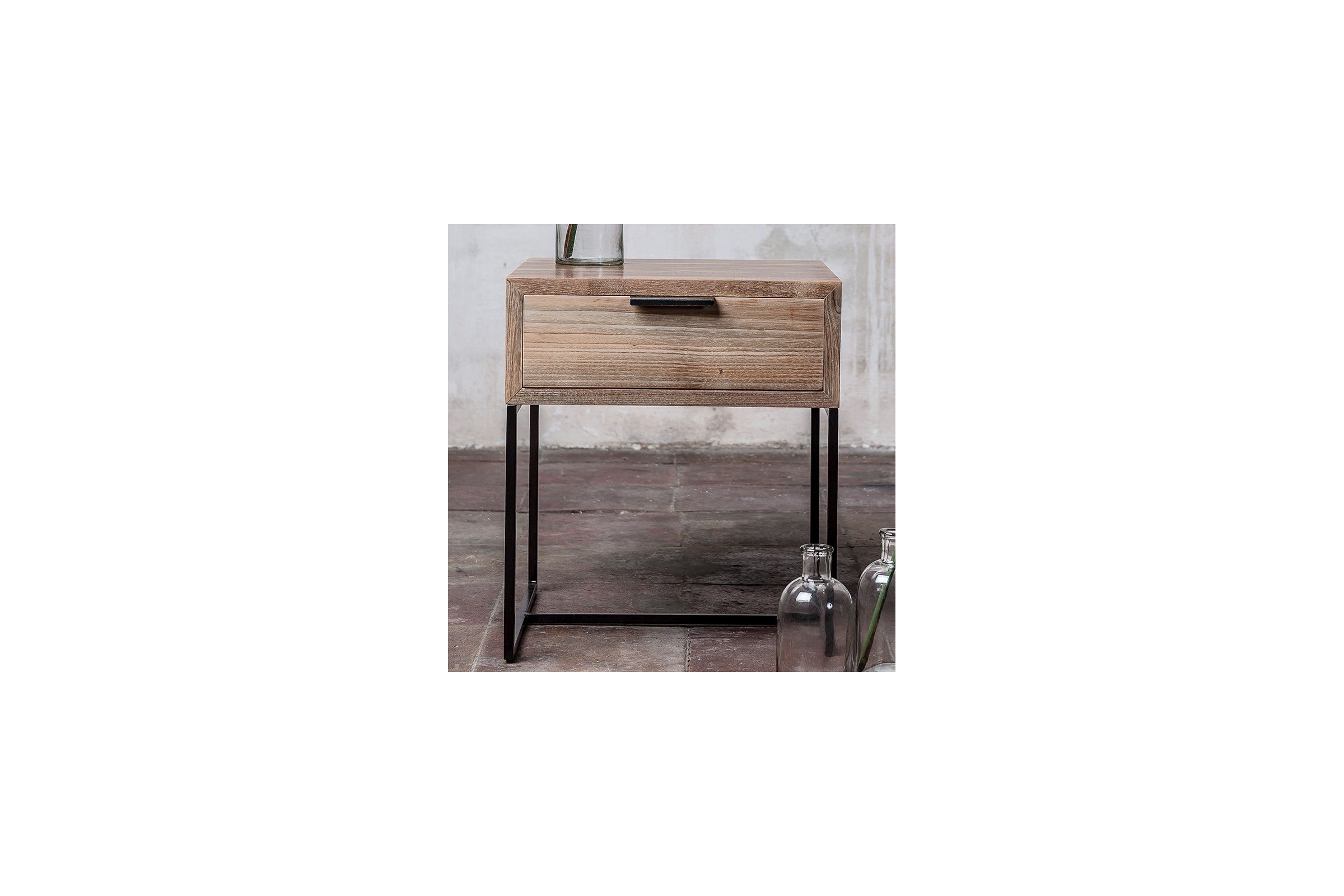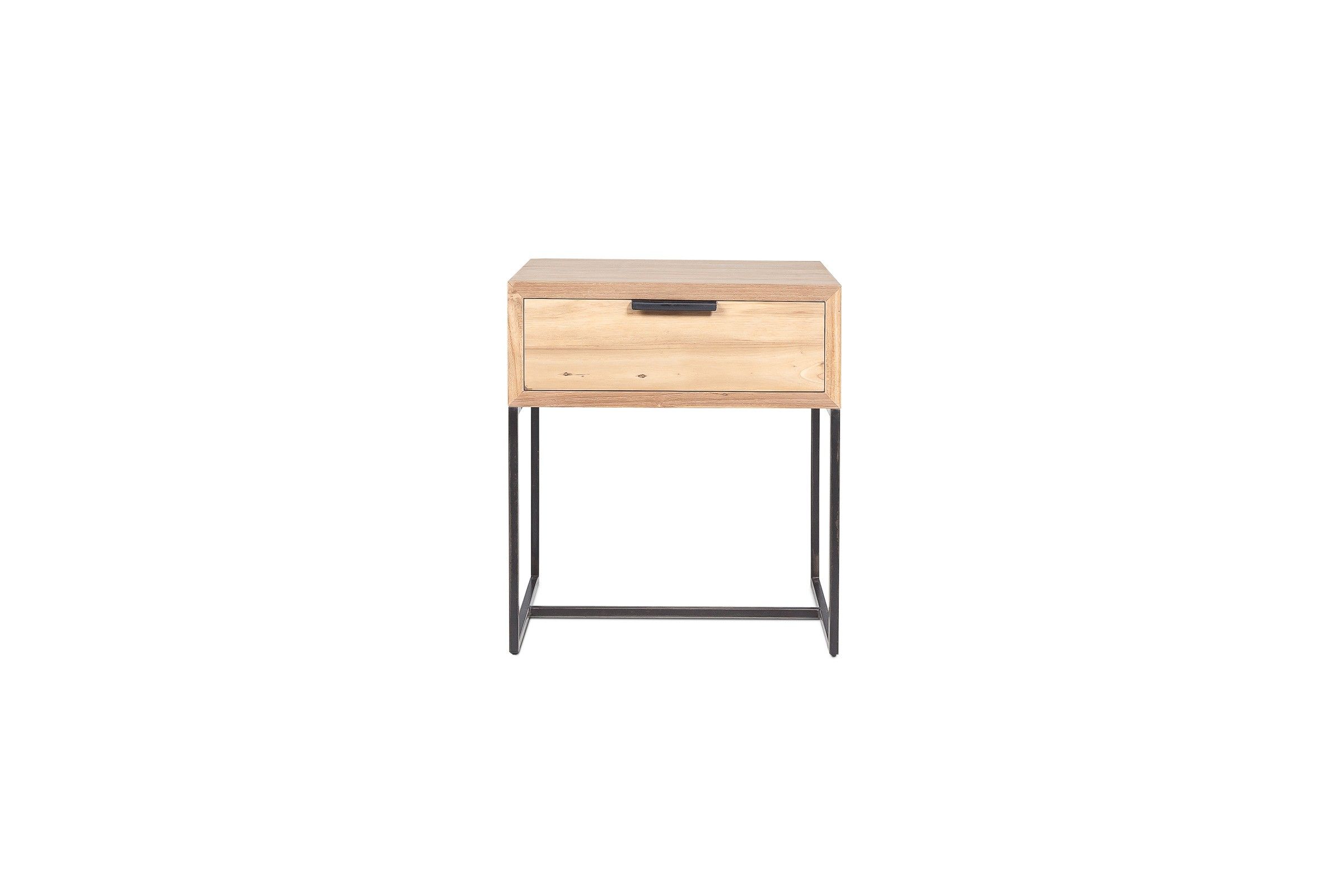 Petite table basse en métal noir avec un plateau et un tiroir en teck recyclé. Fabrication robuste. Cette petite table trouve sa place dans un salon ou dans une chambre comme chevet.