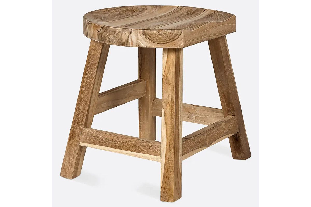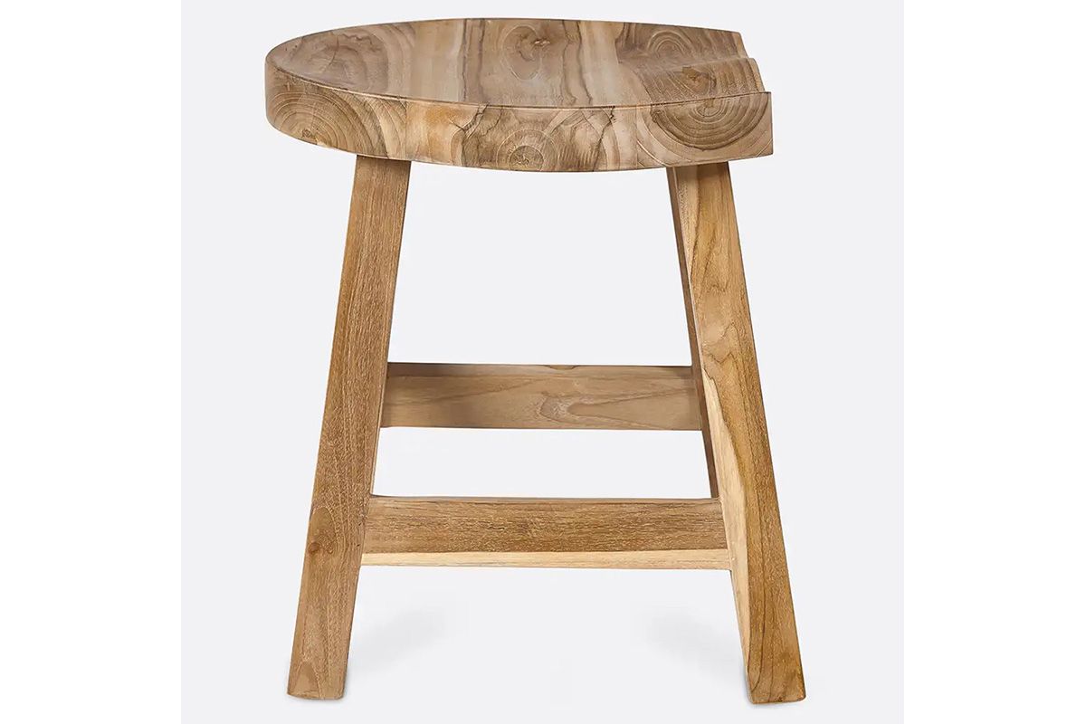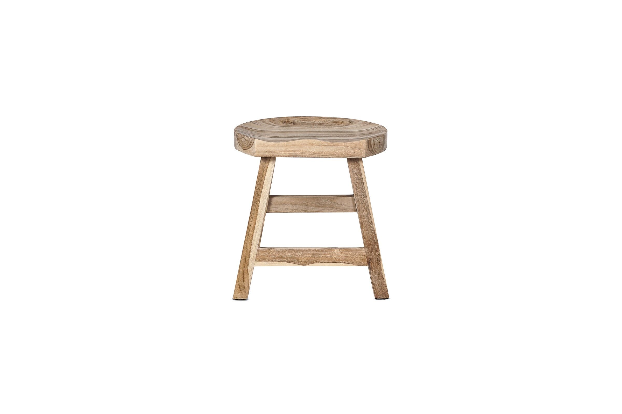 Son assise large et ergonomique, minutieusement sculptée à la main, repose sur quatre robustes pieds carrés en teck recyclé, légèrement évasés pour offrir une meilleure stabilité. Quatre traverses assemblées relient les pieds et servent de repose-pieds pratique. Les belles sections du bois confèrent stabilité et robustesse à ce tabouret en bois de teck.